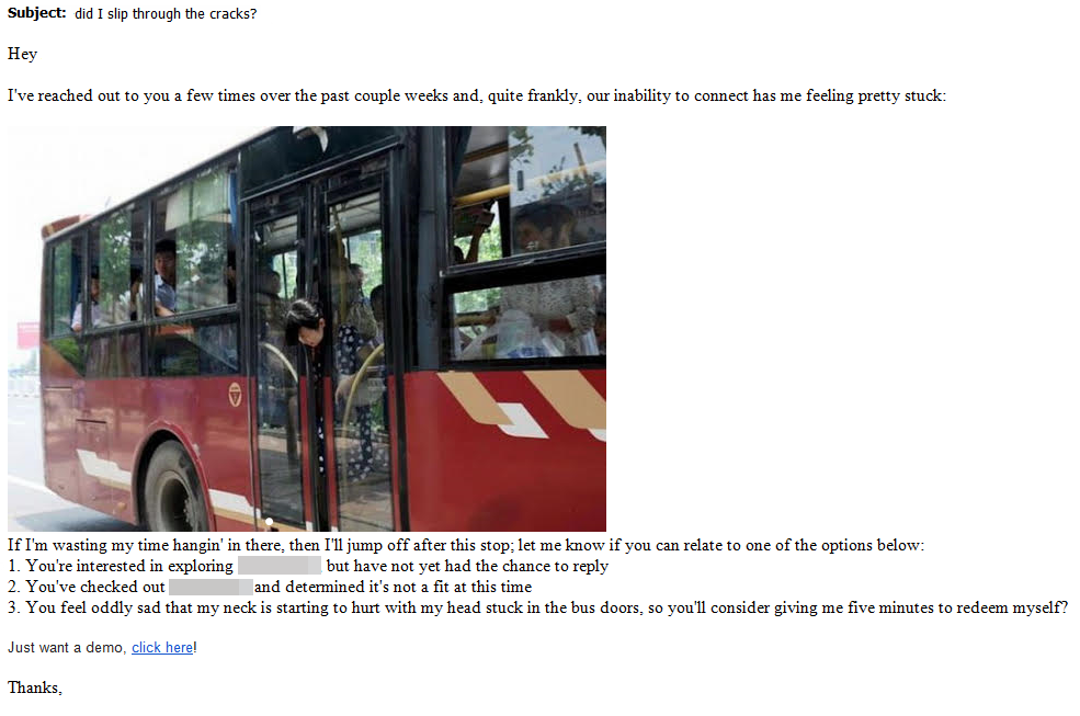 As a copywriter, I get a lot of adhoc requests for “copy” — mostly email copy. Writing effective emails is a rare skill; writing good sales emails even more so. In fact, I keep a folder of all the bad sales emails me coworkers and I have received while at PitchBook.
