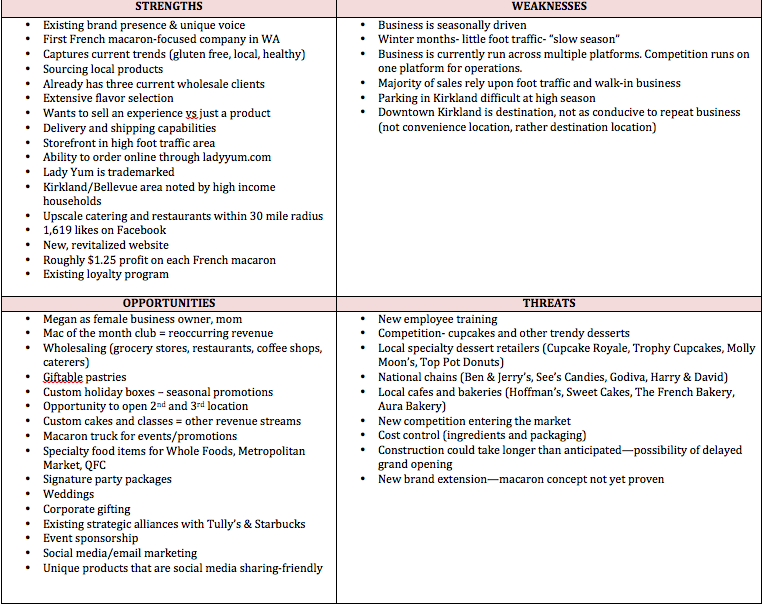 Conducting a SWOT Analysis provided a full picture of Lady Yum’s business and helped to identify specific opportunities for success in context of threats. From this, I was able to make decisions about the best path for Lady Yum’s marketing plan.